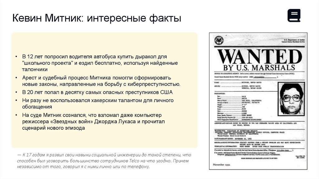Кевин Митник: интересные факты• В 12 лет попросил водителя автобуса купить дыракол для