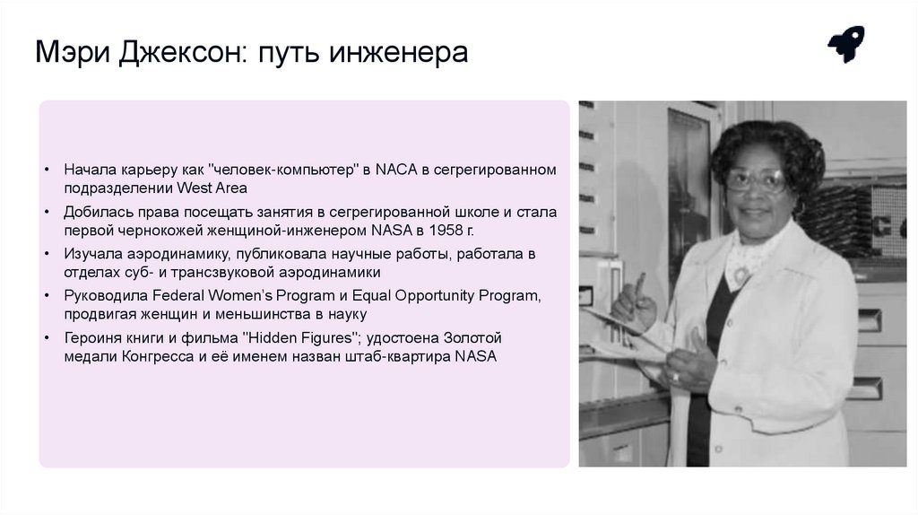 Мэри Джексон: путь инженера• Начала карьеру как "человек-компьютер" в NACA в сегрегированном