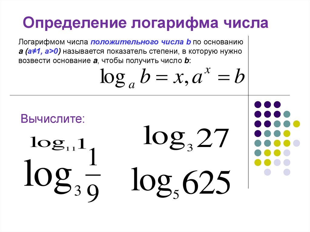 Определение логарифма числаЛогарифмом числа положительного числа b по основанию