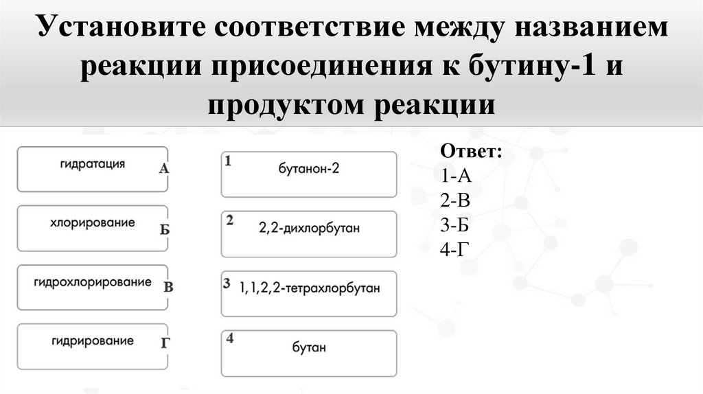 Установите соответствие между названиемреакции присоединения к бутину-1 и