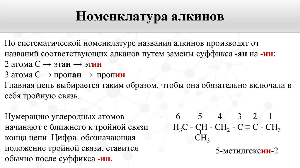 Номенклатура алкиновПо систематической номенклатуре названия алкинов производят от