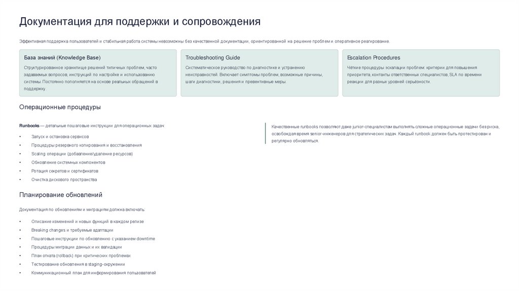 Качественные runbooks позволяют даже junior-специалистам выполнять сложные операционные задачи без риска,