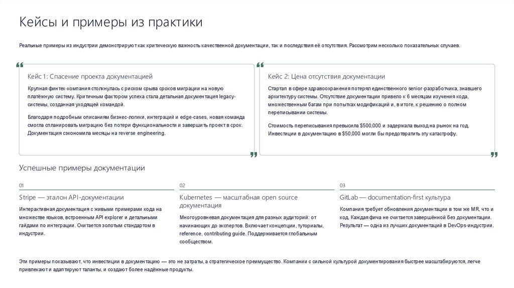 Эти примеры показывают, что инвестиции в документацию — это не затраты, а стратегическое преимущество. Компании с сильной культурой документирования быстрее масштабируются, легче