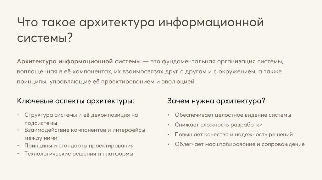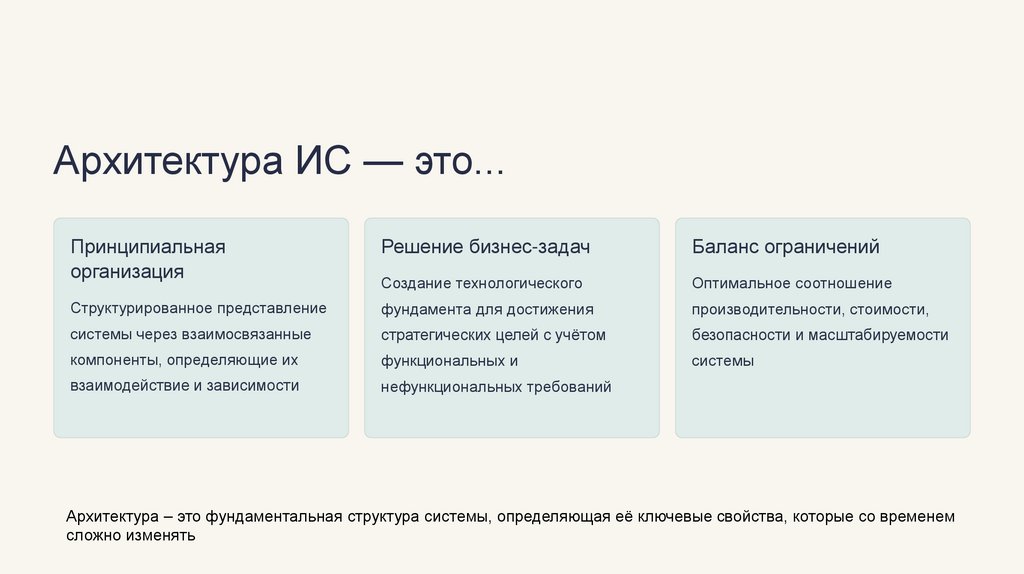 Архитектура – это фундаментальная структура системы, определяющая её ключевые свойства, которые со временем