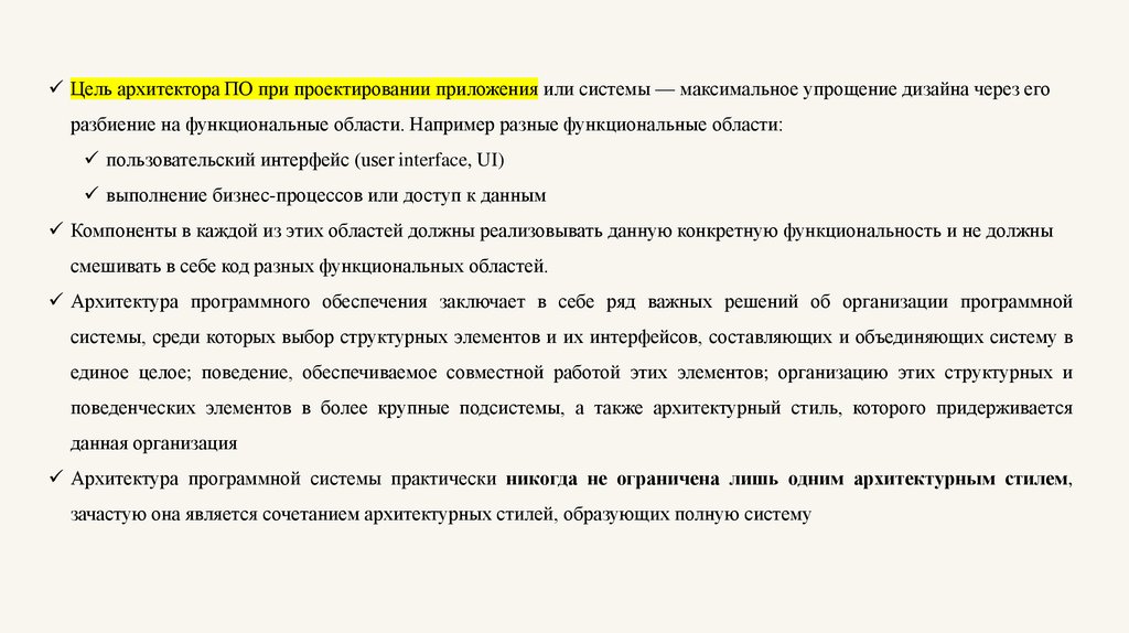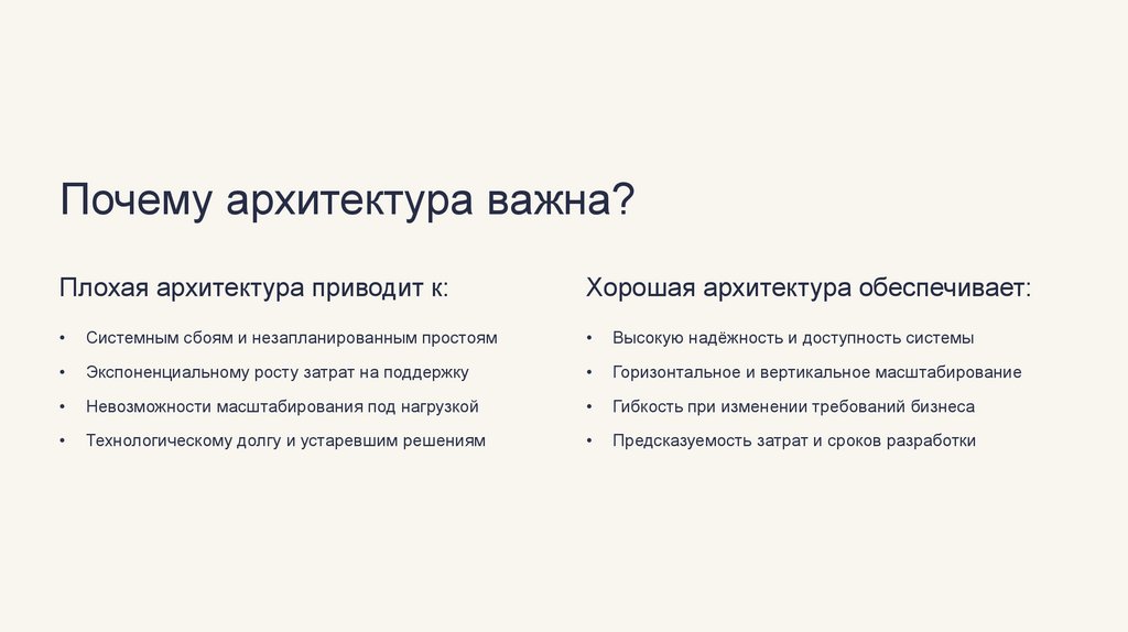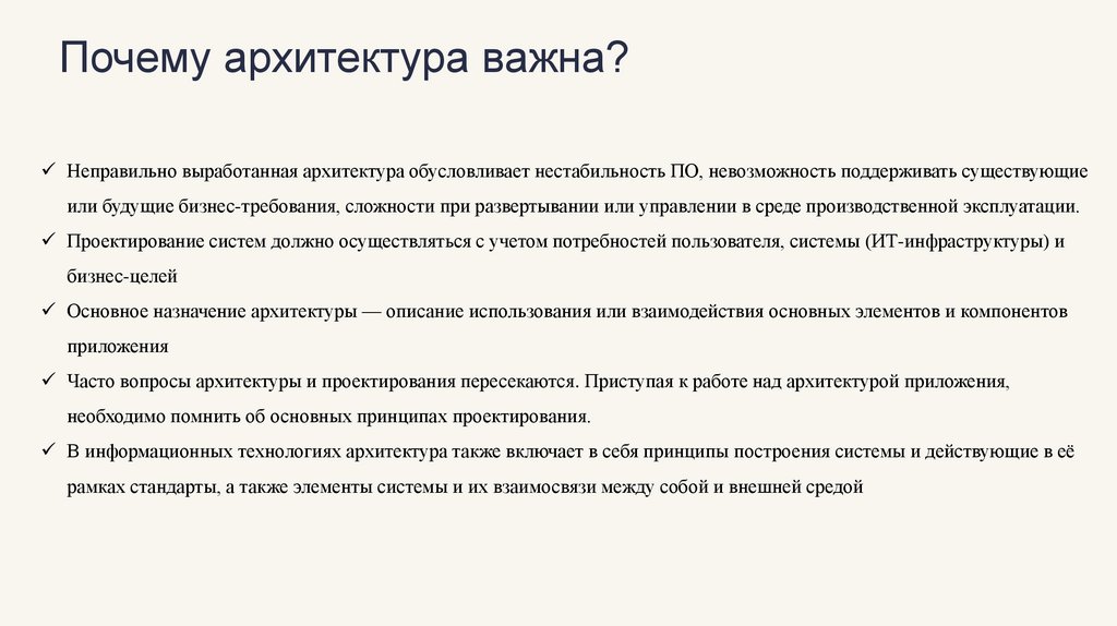 Почему архитектура важна?Неправильно выработанная архитектура обусловливает нестабильность ПО, невозможность поддерживать существующие