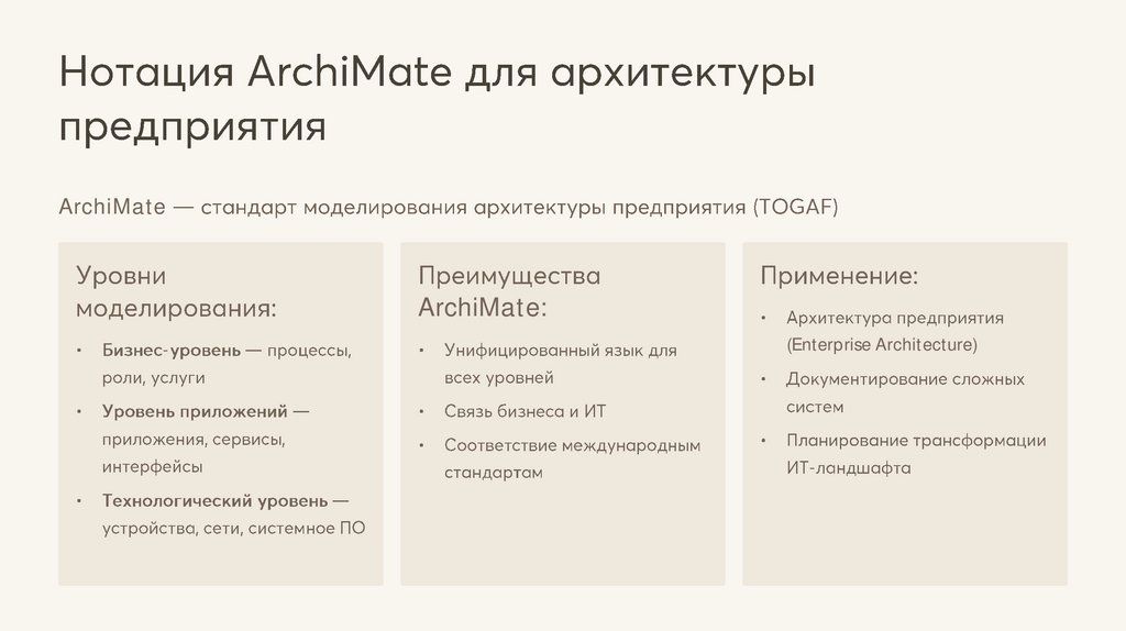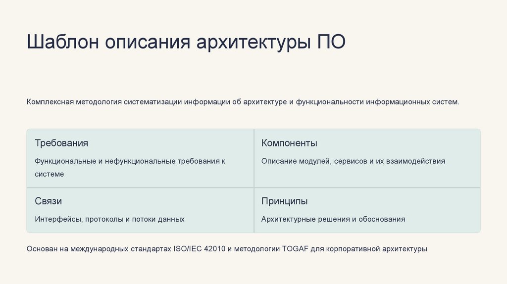 Основан на международных стандартах ISO/IEC 42010 и методологии TOGAF для корпоративной архитектуры