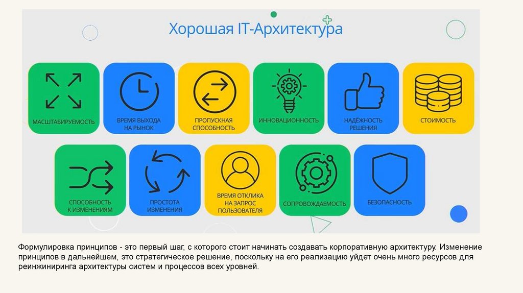 Формулировка принципов - это первый шаг, с которого стоит начинать создавать корпоративную архитектуру. Изменениепринципов в дальнейшем, это стратегическое решение, поскольку на его реализацию уйдет очень много ресурсов для