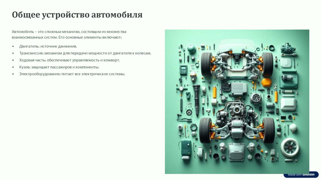 Общее устройство автомобиляАвтомобиль — это сложный механизм, состоящий из множества