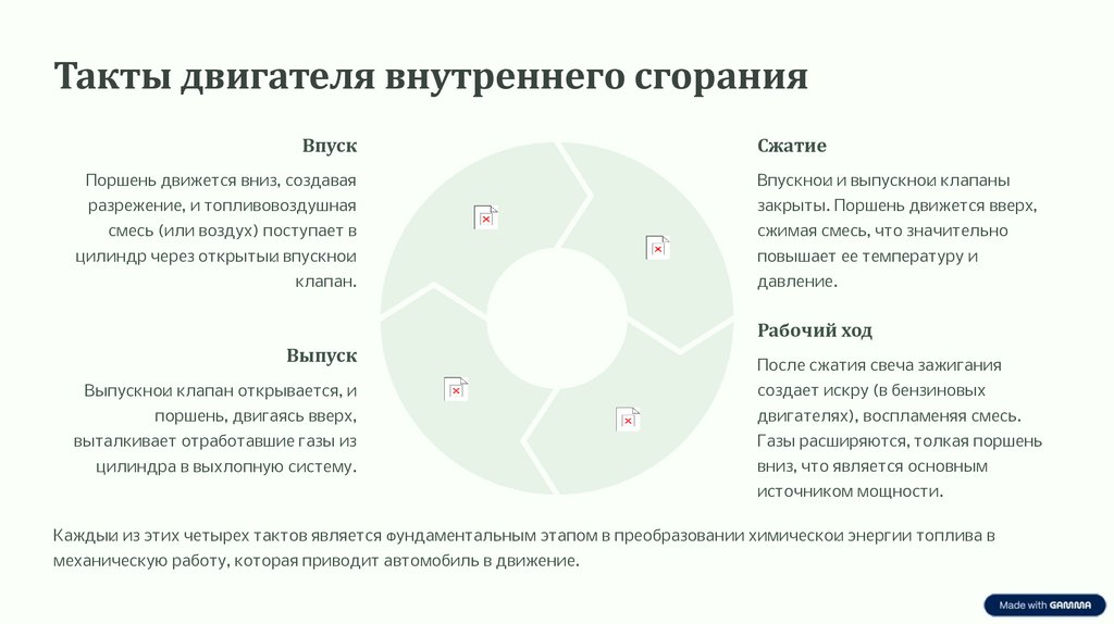 Каждый из этих четырех тактов является фундаментальным этапом в преобразовании химической энергии топлива в