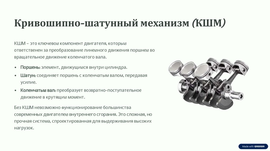 Кривошипно-шатунный механизм (КШМ)КШМ — это ключевой компонент двигателя, который