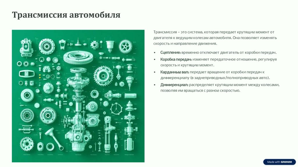 Трансмиссия автомобиляТрансмиссия — это система, которая передает крутящий момент от