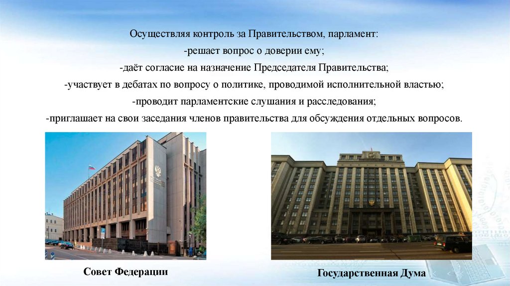 -приглашает на свои заседания членов правительства для обсуждения отдельных вопросов.