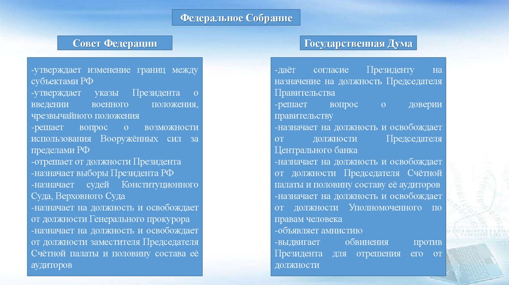 3.Участвует в формировании федеральных органов 3.Назначает на должность и освобождает от