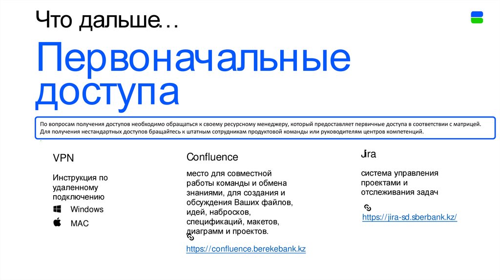 По вопросам получения доступов необходимо обращаться к своему ресурсному менеджеру, который предоставляет первичные доступа в соответствии с матрицей.