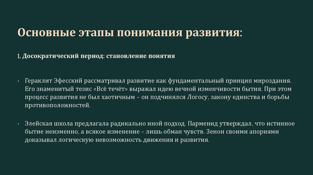 Основные этапы понимания развития:1. Досократический период: становление понятия