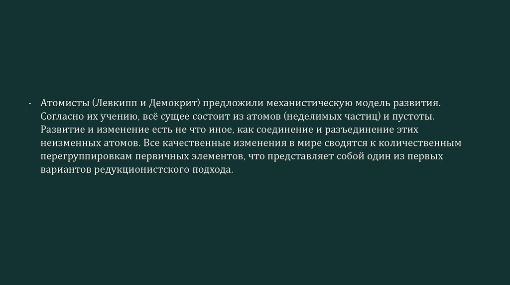 • Атомисты (Левкипп и Демокрит) предложили механистическую модель развития.Согласно их учению, всё сущее состоит из атомов (неделимых частиц) и пустоты.