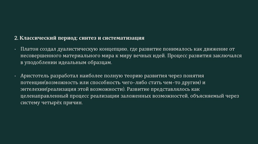 2. Классический период: синтез и систематизация• Платон создал дуалистическую концепцию, где развитие понималось как движение от