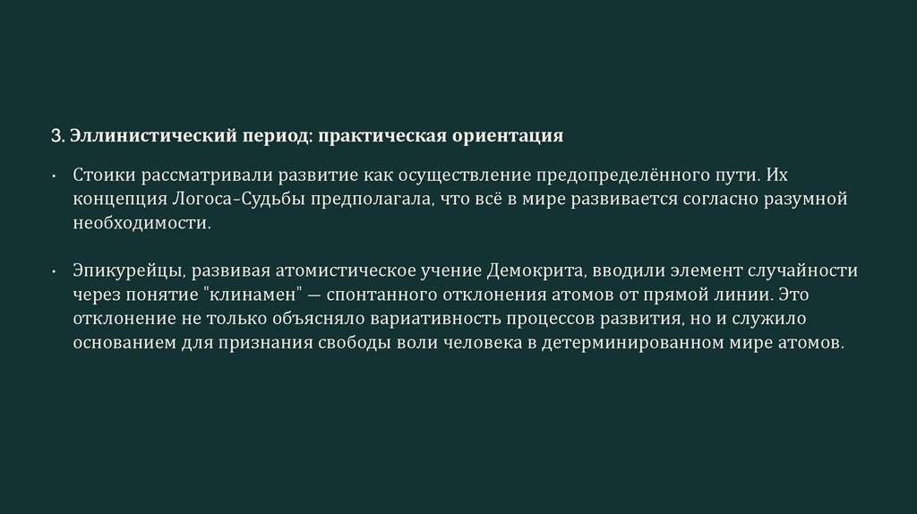 3. Эллинистический период: практическая ориентация• Стоики рассматривали развитие как осуществление предопределённого пути. Их