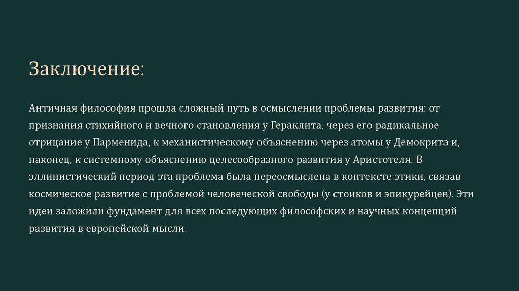 Заключение:Античная философия прошла сложный путь в осмыслении проблемы развития: от