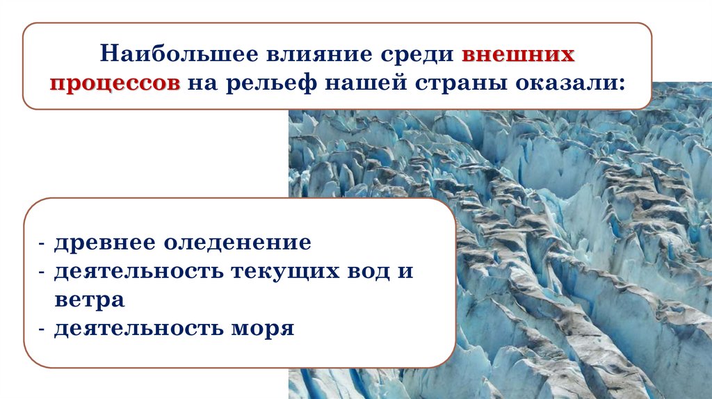 Наибольшее влияние среди внешнихпроцессов на рельеф нашей страны оказали:
