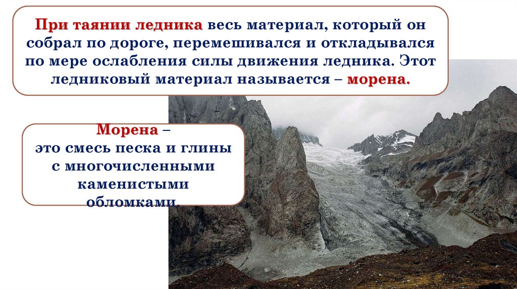 При таянии ледника весь материал, который онсобрал по дороге, перемешивался и откладывался