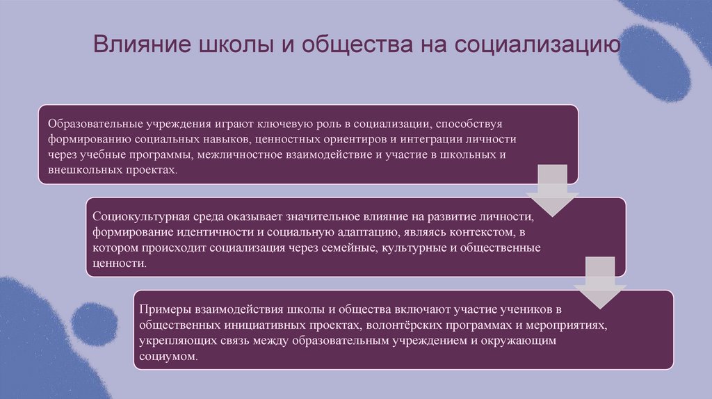 Влияние школы и общества на социализациюОбразовательные учреждения играют ключевую роль в социализации, способствуя