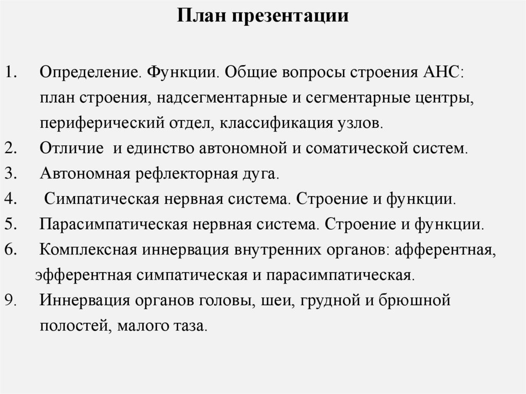 План презентацииОпределение. Функции. Общие вопросы строения АНС: