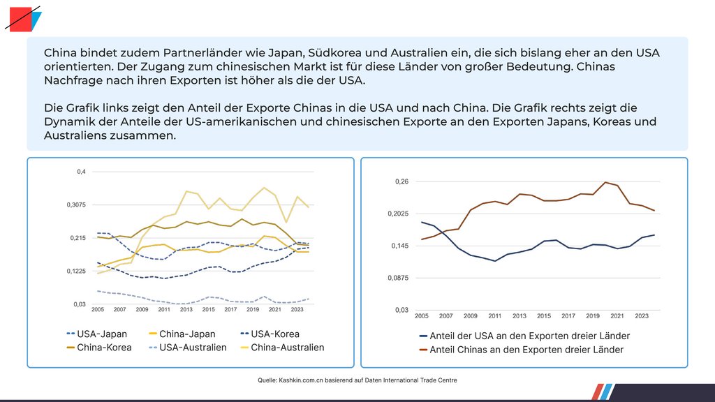 Dynamik der Anteile der US-amerikanischen und chinesischen Exporte an den Exporten Japans, Koreas und