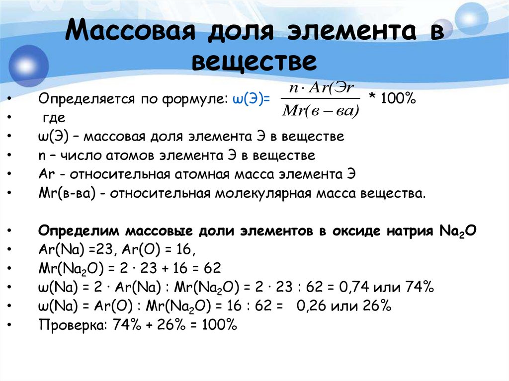 ω(Na) = Ar(O) : Mr(Na2O) = 16 : 62 = 0,26 или 26%