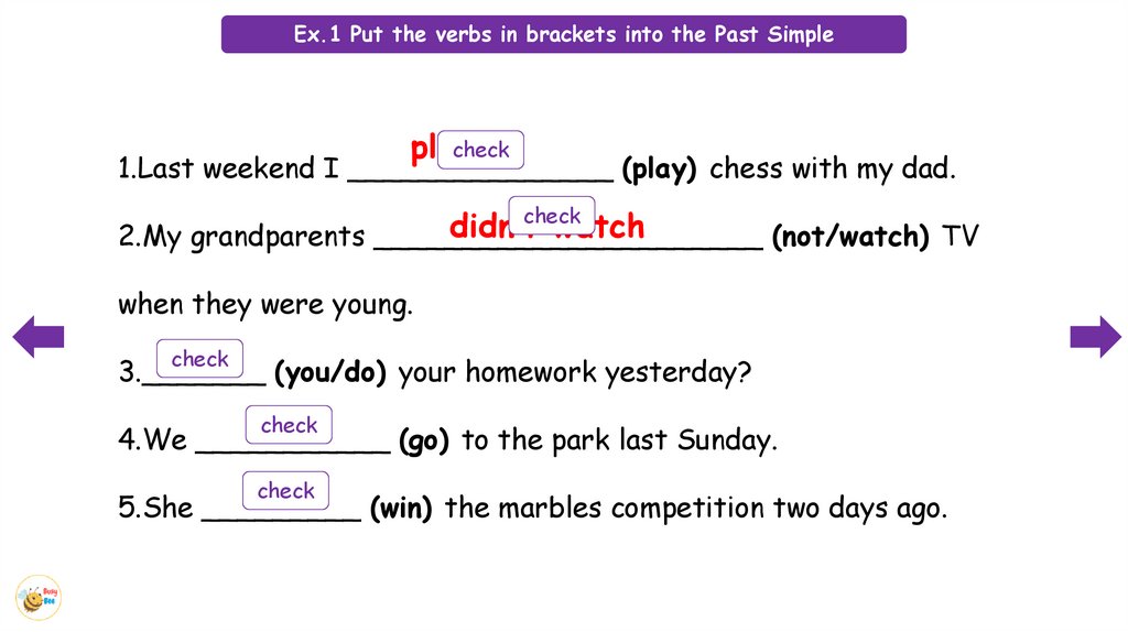 Ex.1 Put the verbs in brackets into the Past Simplecheck