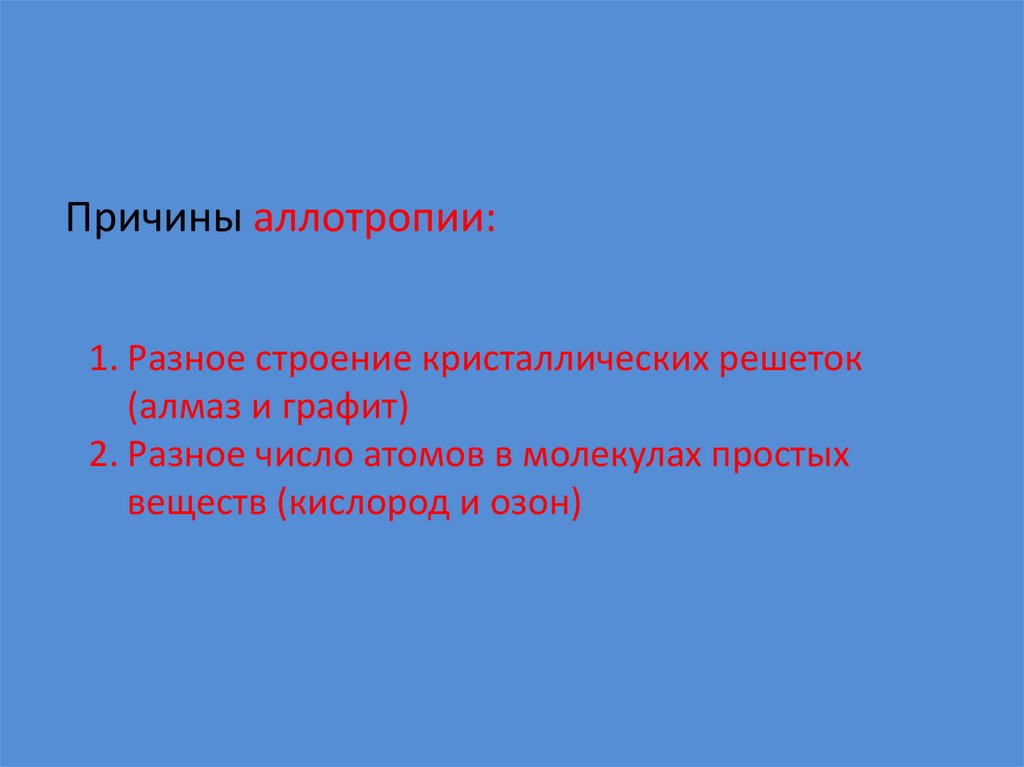 Причины аллотропии:1. Разное строение кристаллических решеток