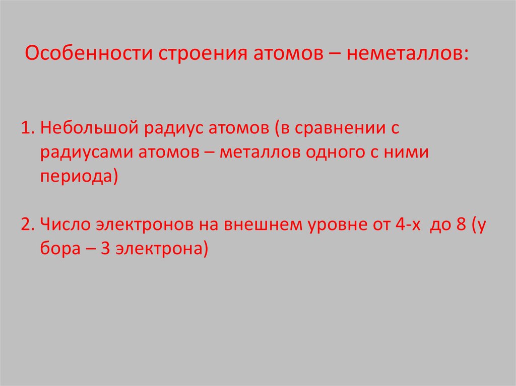 Особенности строения атомов – неметаллов:1. Небольшой радиус атомов (в сравнении с