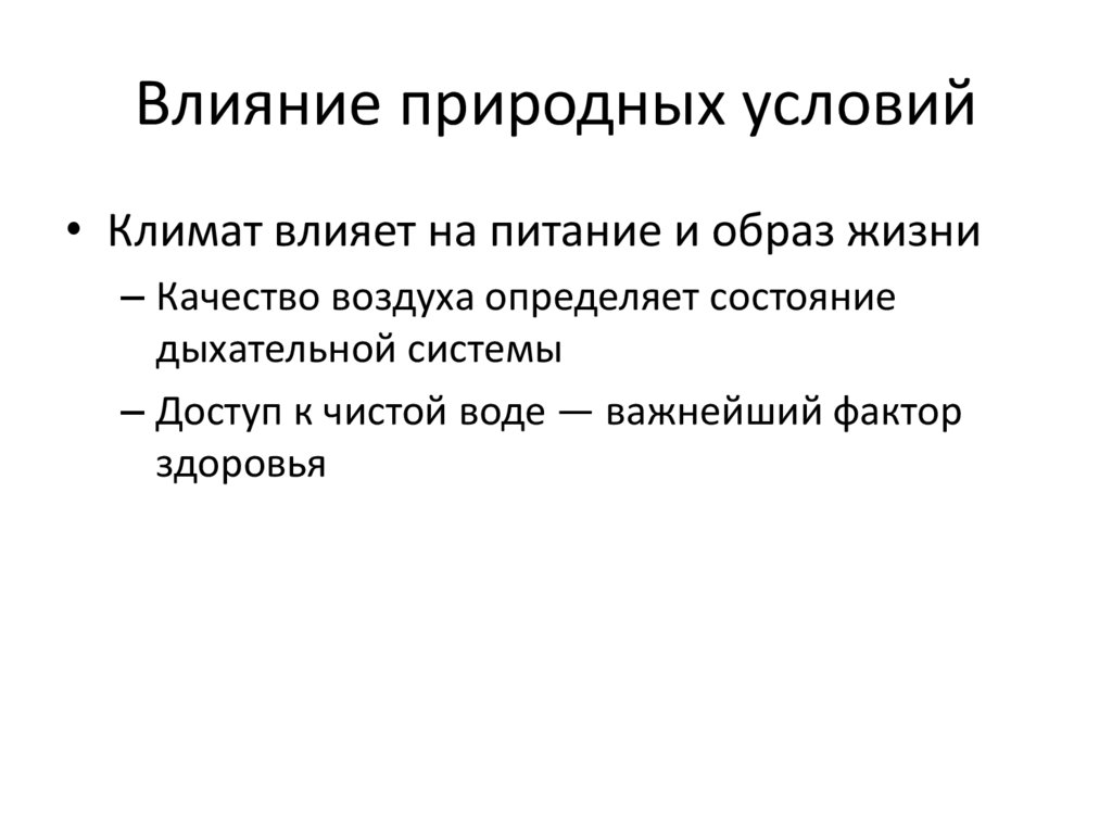 Влияние природных условий• Климат влияет на питание и образ жизни
