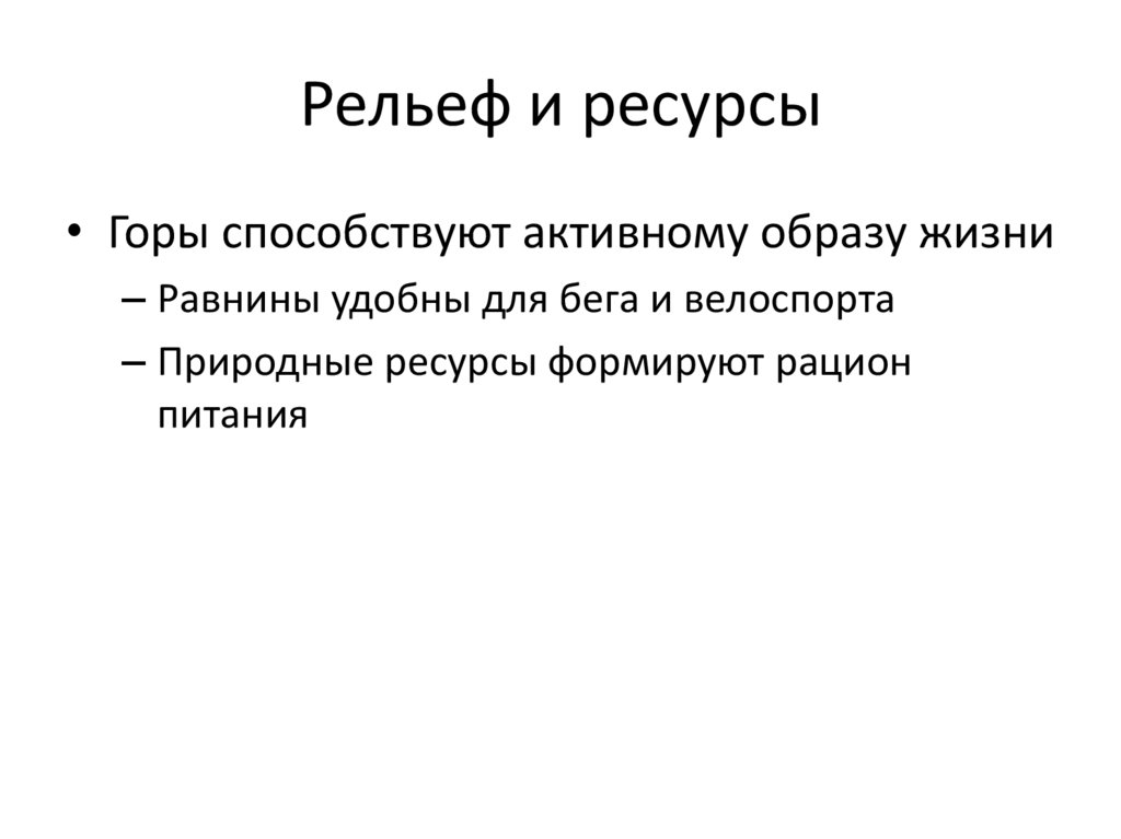 Рельеф и ресурсы• Горы способствуют активному образу жизни