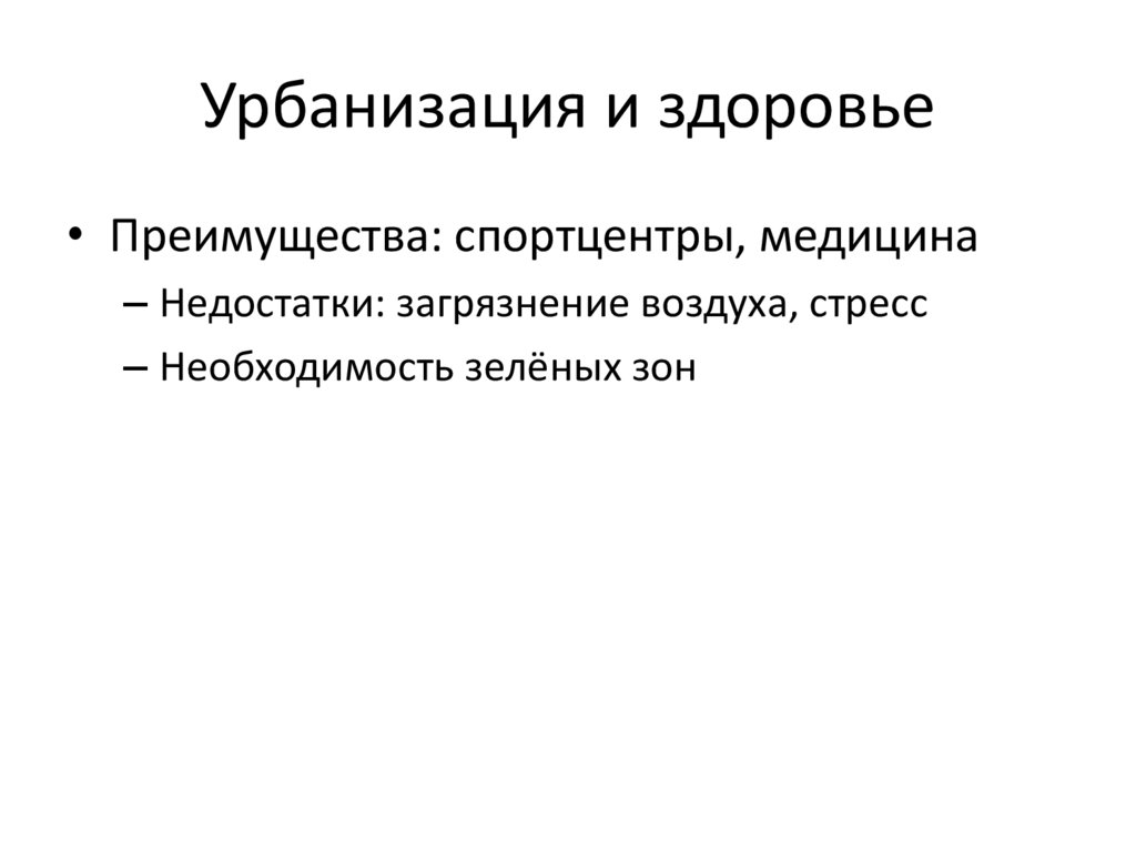 Урбанизация и здоровье• Преимущества: спортцентры, медицина
