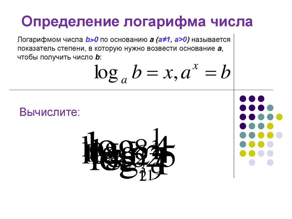 Определение логарифма числаЛогарифмом числа b>0 по основанию a (a≠1, a>0) называется