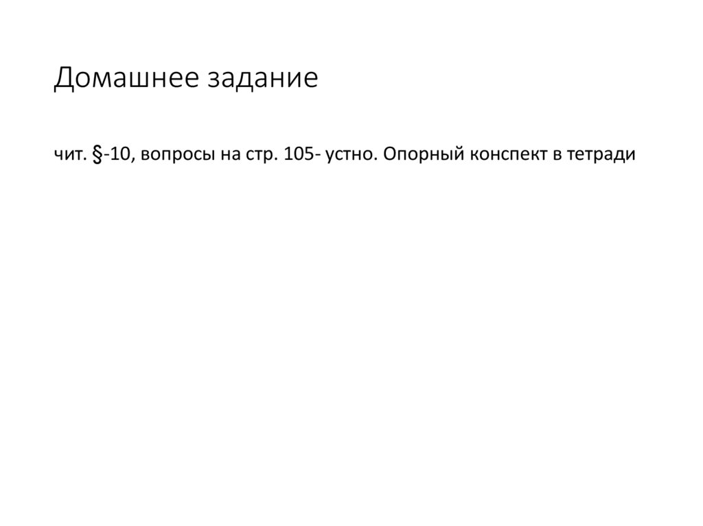 Домашнее заданиечит. §-10, вопросы на стр. 105- устно. Опорный конспект в тетради