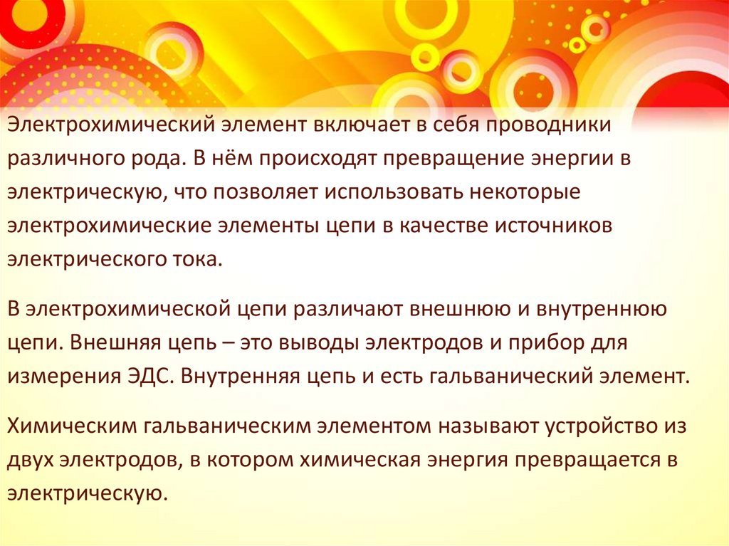 Электрохимический элемент включает в себя проводникиразличного рода. В нём происходят превращение энергии в