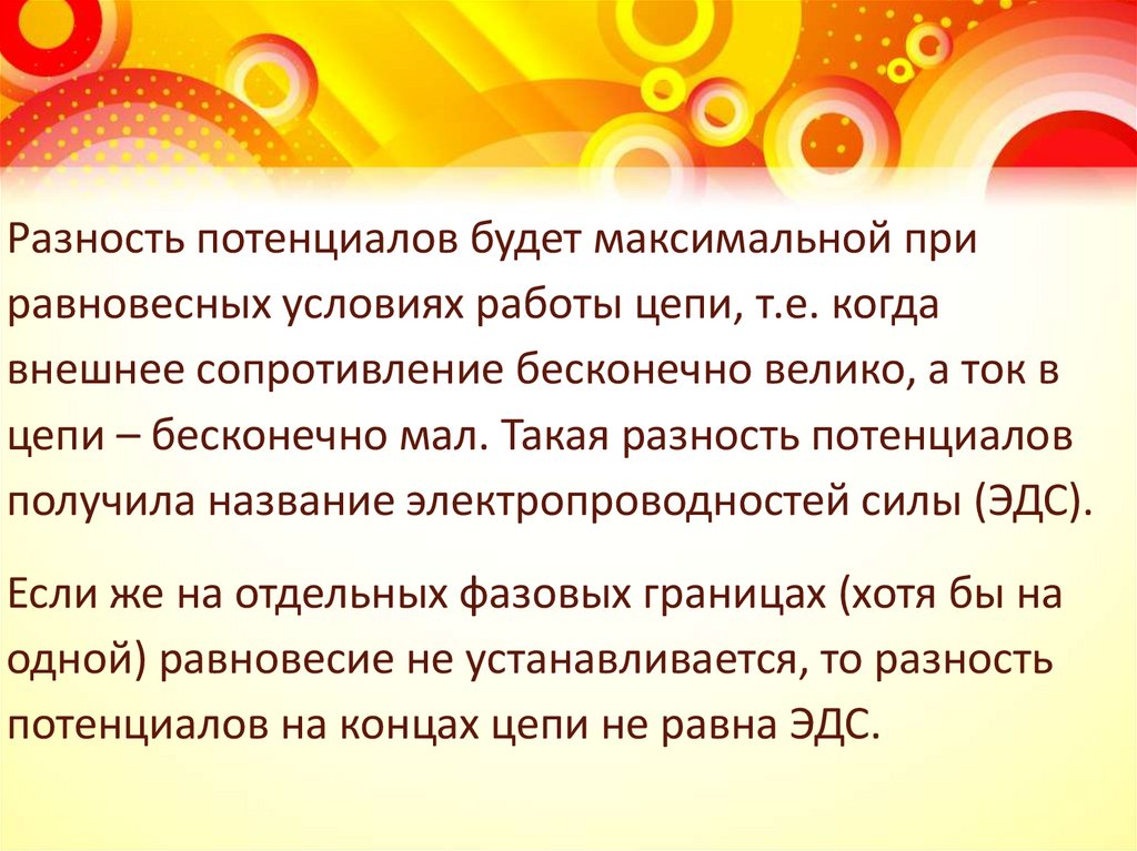 Разность потенциалов будет максимальной приравновесных условиях работы цепи, т.е. когда