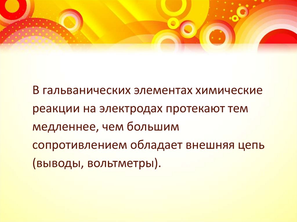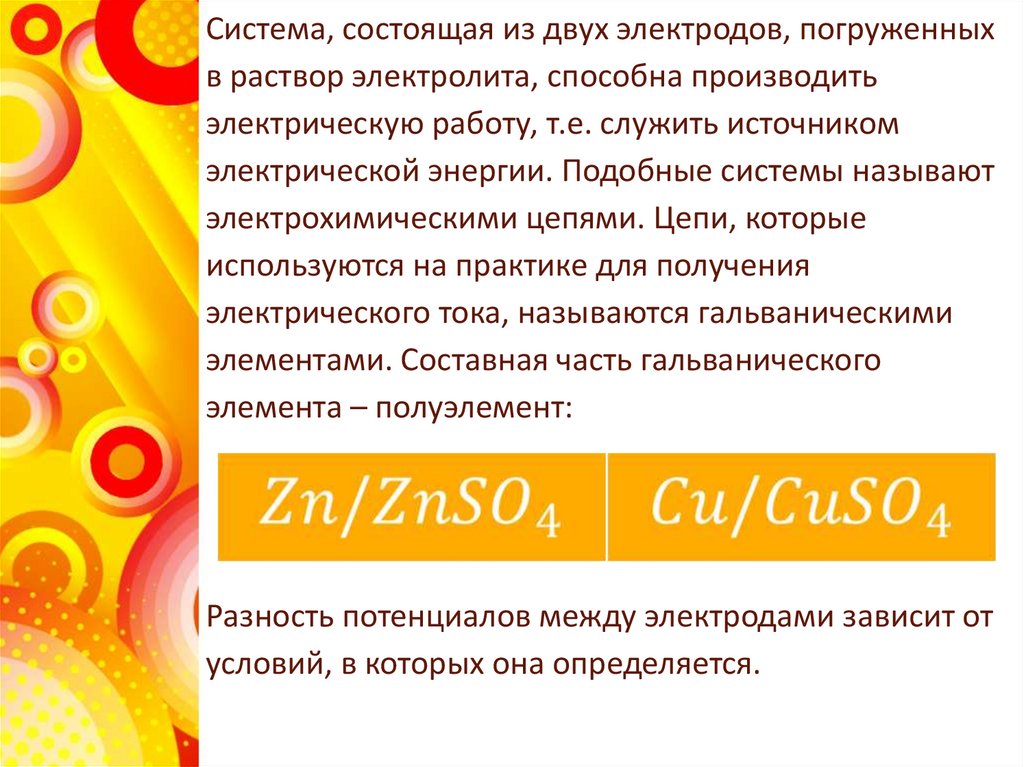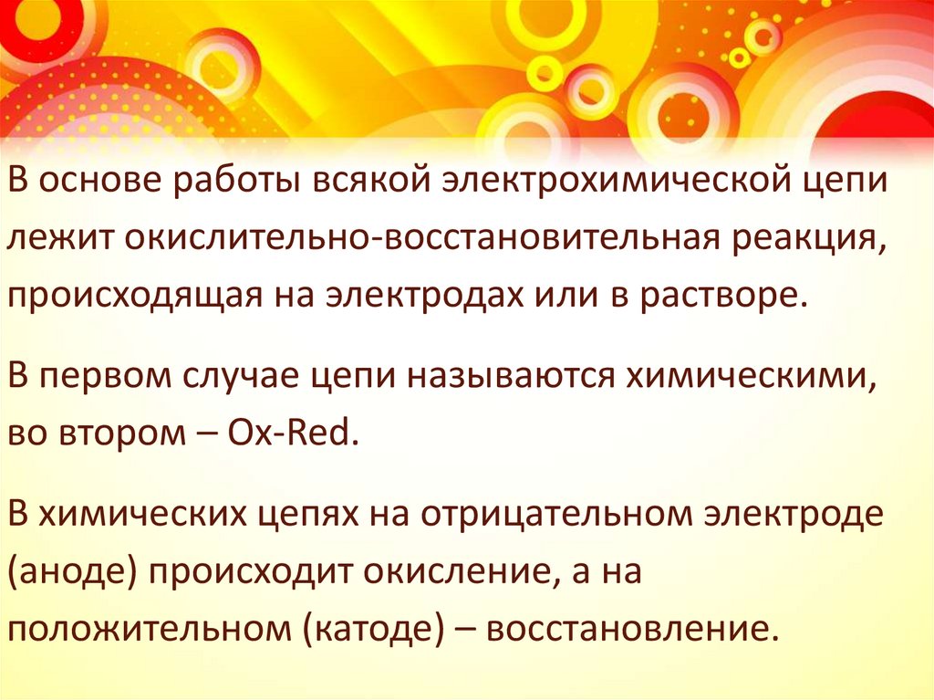 В основе работы всякой электрохимической цепилежит окислительно-восстановительная реакция,