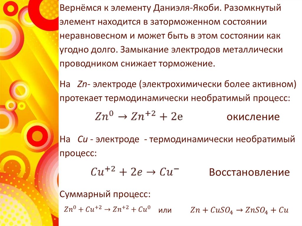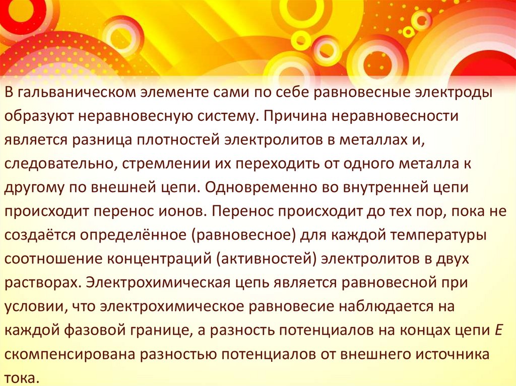 В гальваническом элементе сами по себе равновесные электродыобразуют неравновесную систему. Причина неравновесности