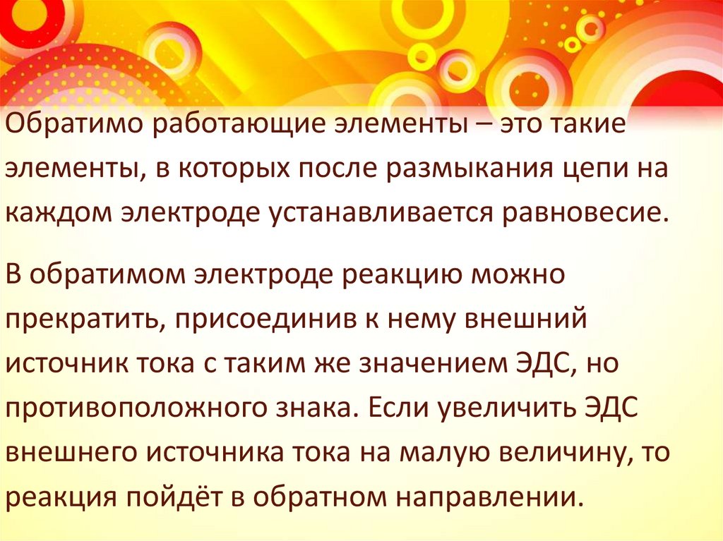 Обратимо работающие элементы – это такиеэлементы, в которых после размыкания цепи на