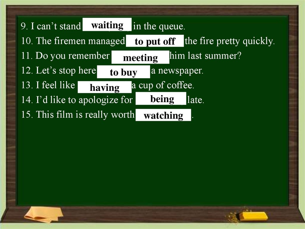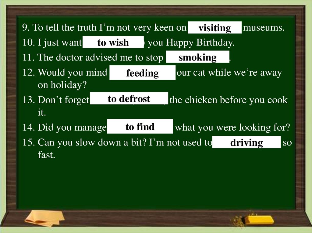 9. Put the verbs in brackets into the infinitive or –ing form: