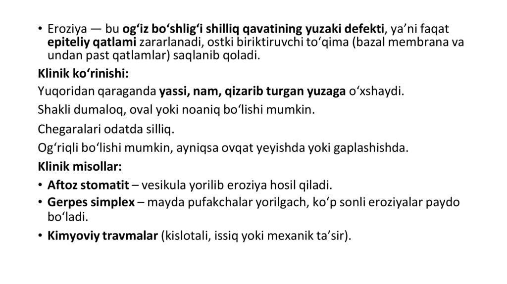 • Eroziya — bu og‘iz bo‘shlig‘i shilliq qavatining yuzaki defekti, ya’ni faqatepiteliy qatlami zararlanadi, ostki biriktiruvchi to‘qima (bazal membrana va