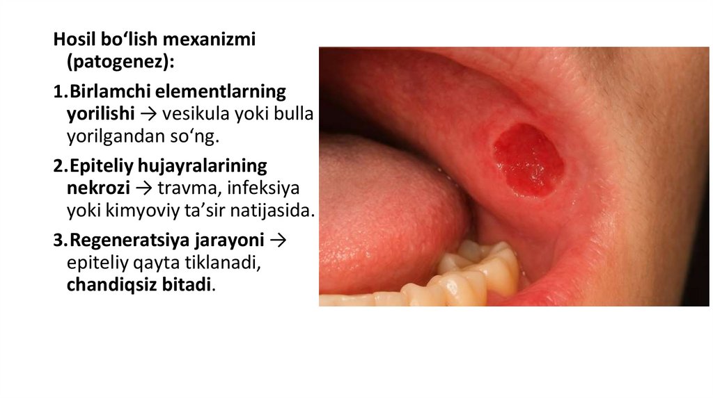 • Aftoz stomatit – vesikula yorilib eroziya hosil qiladi.