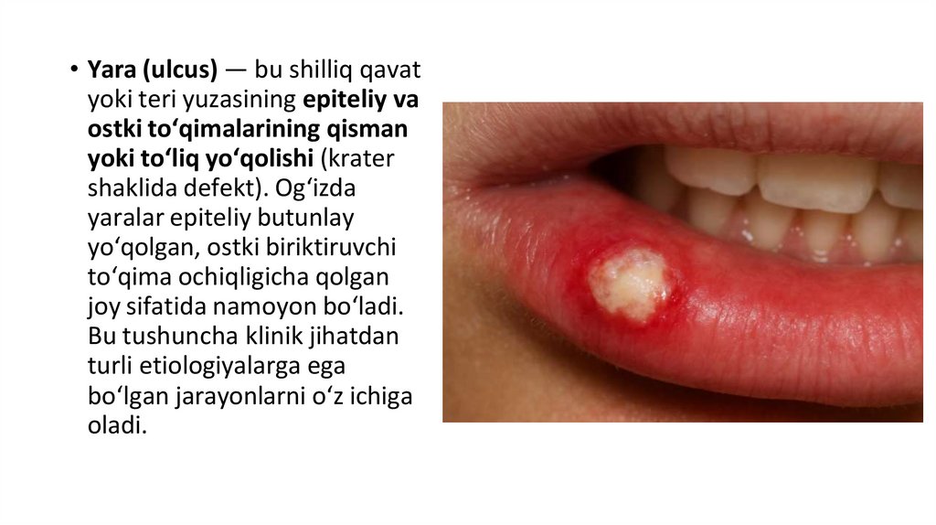 • Yara (ulcus) — bu shilliq qavatyoki teri yuzasining epiteliy va