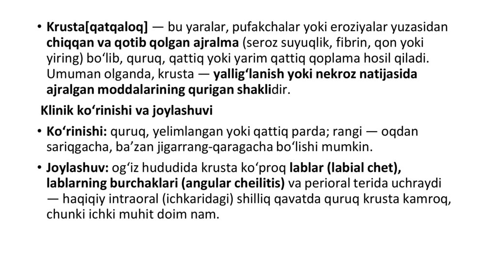 • Krusta[qatqaloq] — bu yaralar, pufakchalar yoki eroziyalar yuzasidanchiqqan va qotib qolgan ajralma (seroz suyuqlik, fibrin, qon yoki