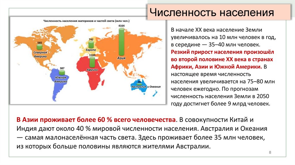 Индия дают около 40 % мировой численности населения. Австралия и Океания