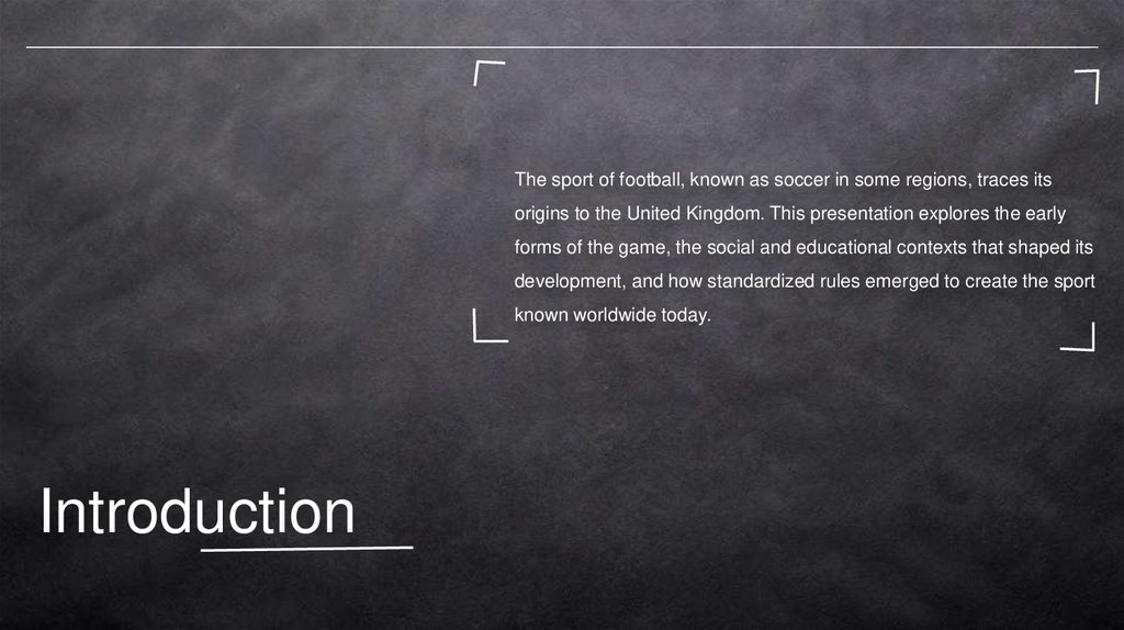The sport of football, known as soccer in some regions, traces itsorigins to the United Kingdom. This presentation explores the early