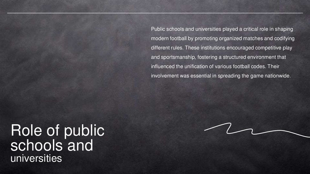 Public schools and universities played a critical role in shapingmodern football by promoting organized matches and codifying
